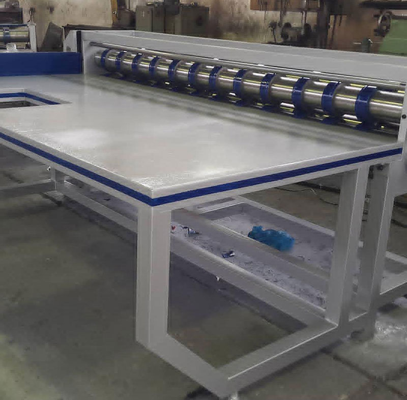 دستگاه باید مجهز به شاسی میز خط کش برش باشد که از جنس پروفیل ساخته می شود و ابعاد استاندارد آن 90 در 90 می باشد. این دستگاه به نحوی طراحی و تولید می شود که توانایی تا انداختن و برش انواع کارتن های کوچک و بزرگ، کارتن یخچال و تلویزیون، کارتن پیتزا و … را دارد و اگر صنایع تمایل به راه اندازی خط تولید نمونه های 3 لایه و 5 لایه داشته باشند می توانند از دستگاه خط کش برش و دستگاه چاپ غلطکی و دستگاه چاک زن کارتن استفاده کنند.